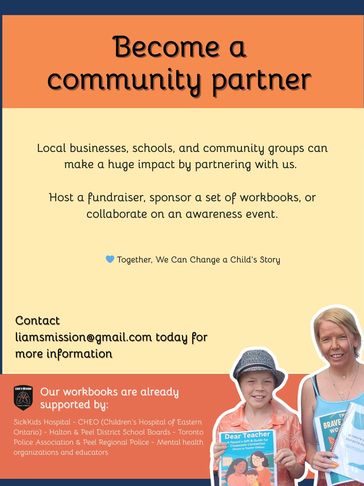 Local businesses, schools, and community groups can make a significant impact by partnering with us to support Liam's Mission. Whether you host a fundraiser, sponsor a set of workbooks for a school, or collaborate on an awareness event for the SickKids Foundation, together, we can create change right where we live.