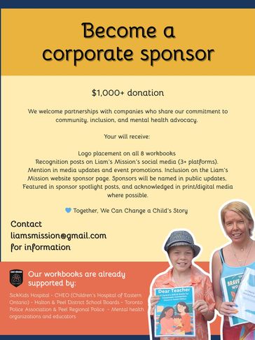 We welcome partnerships with companies who share our commitment to community, inclusion, and mental health advocacy, particularly in supporting initiatives like Liam's Mission for children affected by Cystic Fibrosis. Corporate sponsorship opportunities include logo placement, event collaboration, media exposure, and the chance to help us reach our 5,000 workbook donation goal in collaboration with the SickKids Foundation. Together, we can give children hope, tools, and a voice. Whether you donate, partner, or sponsor—you’re helping us write a better story for families living with invisible illnesses.